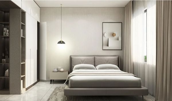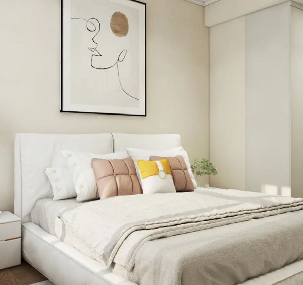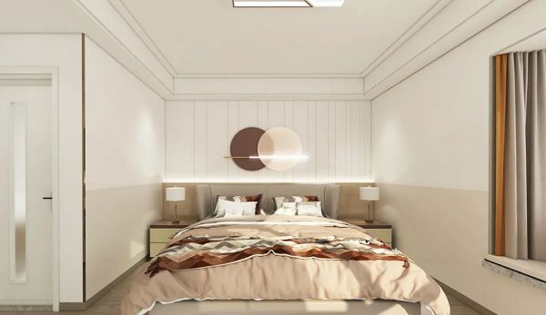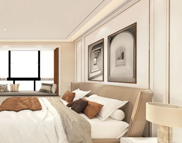以米白色做背景打造现代卧室,当温润有礼的茶色,落在不同颜色层次的床品、窗帘上,加深了空间效果。辅佐以中性色及些许暖色,将生活的质地与从容的姿态尽数展现。