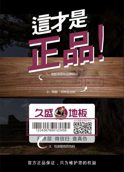 久盛地板作为“中国家居正品查询平台”的创始单位,久盛始终坚持从根本上杜绝制假售假,保障消费者和商家权益,为净化市场环境,推动国家经济健康可持续发展而实践着。今天就为大家分享三种识别久盛官方正品的方法: