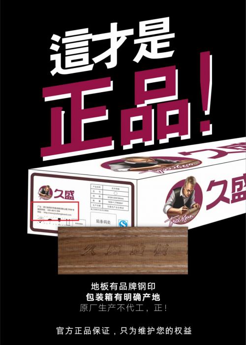 久盛品牌生产的每块地板背面都印有“久盛地板”的字样,并在包装箱上印有明确的生产地,杜绝代工,始终坚持“原厂生产,绝不贴牌”的生产法则,保障产品质量可控性,让消费者买得放心,用得安心。