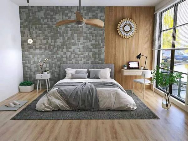 卧室的背景墙选用的是两种不同的材质,面积较大的那部分颜色对应着占地面积小的床铺颜色,小面积的木色对应地板的颜色,这种此消彼长、相互呼应,达到一种动态平衡、阴阳相生的东方哲学韵味。