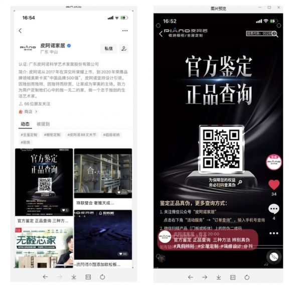 为加快传播,让更多消费者获知查询通道,皮阿诺抖音号、视频也同步发布真伪查询宣导视频,加大宣传力度,方便消费者与经销商查询皮阿诺订单正品信息。