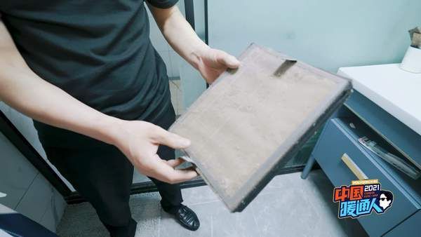 节目现场,为了更加直观的感受新风系统的功能与效果,郭峰一气呵成地展现了一手拆机“绝活儿”,现场拆解新风主机,取出滤芯,我们能够非常清晰、直观地感受新风的功能效果,使用一年后,新风滤芯纸已经变黑,积了一层非常厚的灰。