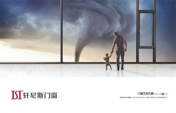 在2021年,轩尼斯门窗基于品牌发展理念创新以及品牌发展战略升级,对主广告画面进行升级,从婴儿倒立转变成爷爷牵着孩子的手透过轩尼斯门窗直面风暴的场景。