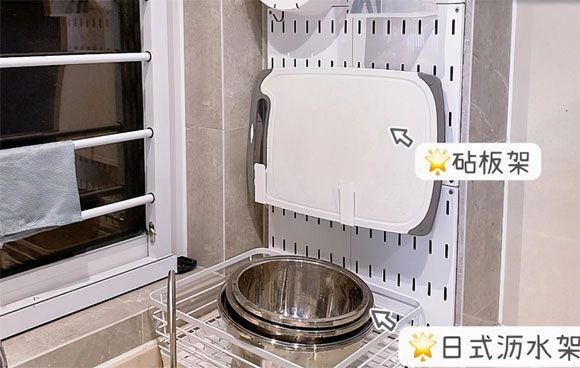 这里主要放的是比较大件的厨具用具,买单独的砧板架上墙也可以。沥水需求不是很多的可以买伸缩沥水架,会更加的节约空间。