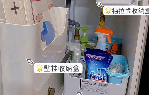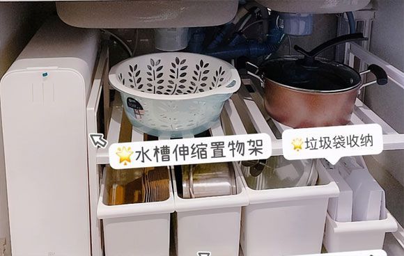 水槽下面的空间真的很大,特别适合放锅具这类大件,可以买置物架或者分层架充分利用上下空间。现在还有专门针对水槽下空间设计的可伸缩置物架,价格不高却特别实用,强烈建议配一个。