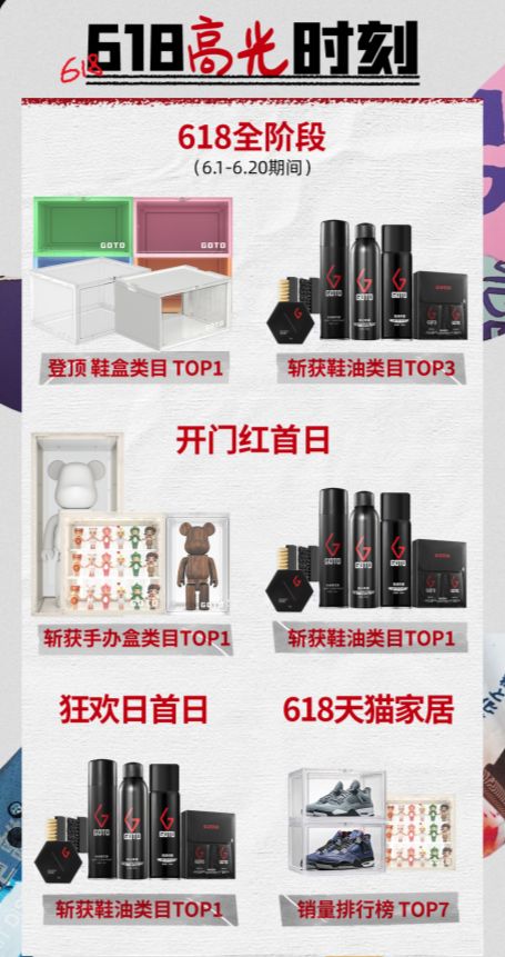 作为潮流生活品牌GOTO,消费群体为大部分为Z世代的年轻人,品牌细分品类产品如球鞋收纳盒、手办收纳盒在某程度上满足了他们的新兴需求,行业类目上也理所应当坐拥TOP1的位置,斩获了618全阶段天猫鞋盒、鞋油品类的TOP1的位置。首发新品更是锐不可当,其中广州城市限定「一盅几件」鞋盒套装上线后当日即售罄,新款灯光手办收纳盒爆卖1300K+。