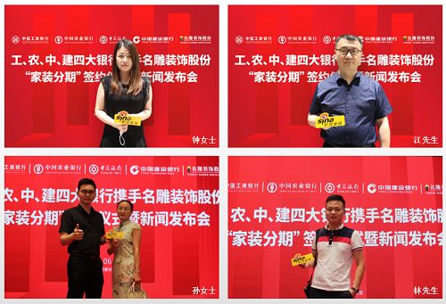 2021年6月18日,工、农、中、建四大领军标杆银行,共同携手头部装企名雕装饰展开家装分期签约仪式,打开银行与家装企业深度合作的空间。新浪记者随机采访到几位签约客户,听听他们为什么选择家装分期,以下为访谈内容: