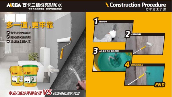 西卡MEGA防水系列产品与普通防水产品有什么不同?现在市面上的防水都是双组份或单组份的,西卡MEGA是三组份的,多了一道创新界面处理工艺。传统基面处理需要清水润湿,西卡MEGA配套了专业的界面剂,基面底涂免润湿,封闭强化基层,有效增强防水层和基面附着力,大大提升防水效果耐久度。同时,它以亮彩涂层脱颖而出,有效避免漏涂漏刷。西卡MEGA防水系列产品广泛适用于卫生间、厨房、阳台及容易受潮墙面及场所。