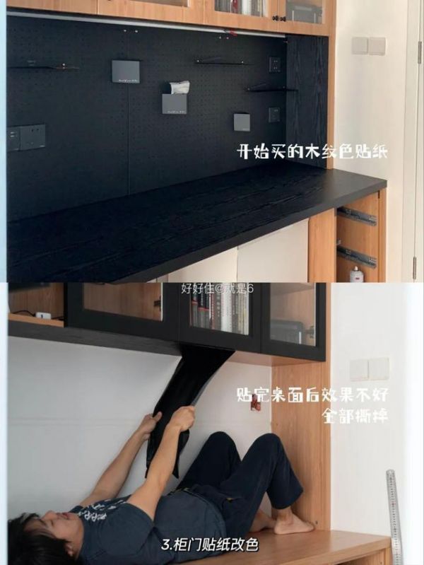 贴纸原来是黑底木纹色,贴上后效果不好,不能凑合,我又全部揭下来,纯黑色贴纸重贴!这个过程很磨人,没耐心地慎入。