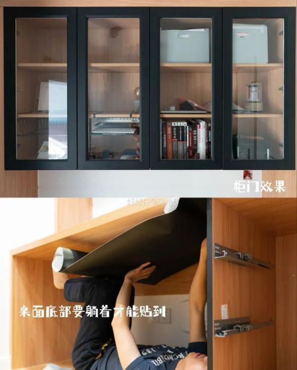 3. 柜门用自粘贴纸贴好,玻璃门柜内部我没有贴,感觉里面保留木色也不错,不喜欢的可以把里面也贴上,抽屉、桌面底部侧面,其他能露出来的地方我都贴了。