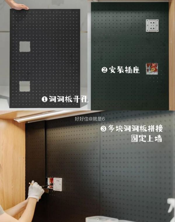 2. 洞洞板是成品的,自己裁切了一下把几块拼接起来,墙面上的插座测量好位置在洞洞板上挖个洞,插座外装在洞洞板上就可以了。