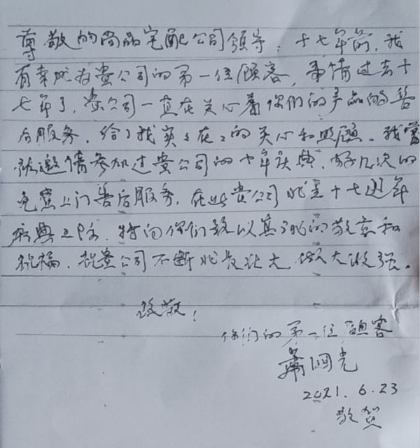 (肖先生为尚品宅配17周年手写祝福信)