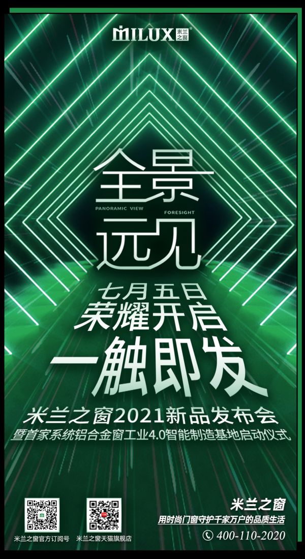 时尚于形,时尚于心。2021米兰之窗时尚再升级,重磅发布2021年度两大新品,全新时尚门窗,是一次高颜值与硬核实力的完美结合,将门窗艺术做到极致,满足人们日益挑剔的审美目光,真正为消费者带来高品质生活的极致体验,届时又会以怎样的外观呈现,具备哪些科技运用?7月5日,将会为您逐一揭晓。