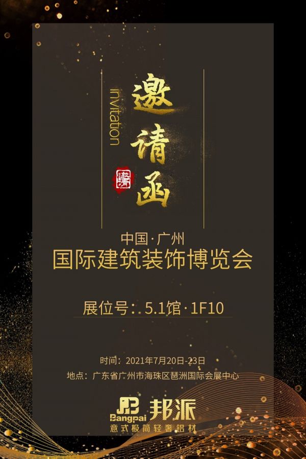 2021年07月20-23日,期待已久的广州国际建材展将如期开展,届时广东邦派轻奢铝材将携业内最新最具性价比产品参展,展会期间,更有许多特价产品等你来!