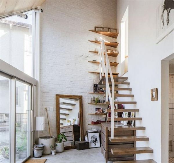 有趣的是,设计师在一侧设计了通往二层的阶梯,这个阶梯采用悬浮式设计,看上去艺术感满满,在角落处还设计了一些三角形的展架,起到一定展示作用的同时,还是非常有趣的。
