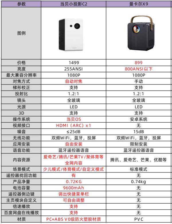 从参数表来说,我们可以明显的看出曼卡尔X9投影仪相对于当贝C2在实际使用功能上是有欠缺的部分。