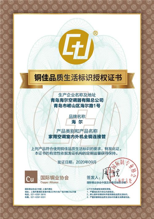 7月2日,中国家用电器协会、国际铜业协会联合国美电器及众多优质空调品牌,在北京启动了“铜佳标识品质空调普及促销月”活动。在现场,国际铜业协会为海尔全产品系列(包括海尔牌、卡萨帝牌)授予“铜佳标识品质空调”证书,“纯铜管”品质得到官方认证。