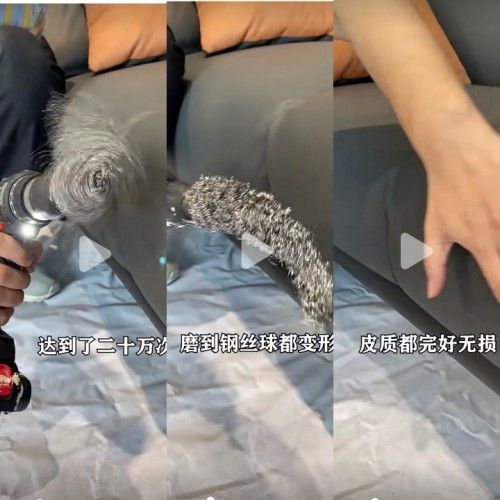 为测试耐磨耐刮度,暴力主播用上了带钢丝球的电钻,疯狂磨蹭沙发表面,直到钢丝球都变型了,沙发表皮依然完好无损。更何况像刻刀,剪刀这些小Case,任其数次刮蹭,沙发岿然不动。据悉,硅胶皮材料突破了传统皮质面料的物理性能,在专业实验室条件测试下,硅胶皮历经了20万次摩擦实验,皮质也不会出现破损。不论是孩子的玩具刮蹭,还是猫狗的利爪这些破坏,在蓓蕾莎硅胶皮沙发面前都无计可施。这一优越的产品特性,对于家中有宠物或熊孩子的年轻家庭,无疑十分友好。