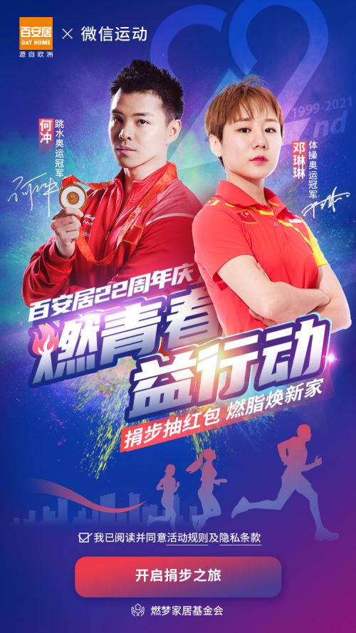为了倡导健康生活方式、释放青春能量,在这个值得共同庆贺的特殊时刻,百安居以“燃青春,益行动”为主题,邀请跳水奥运冠军何冲和体操奥运冠军邓琳琳助力,以微信运动平台为承载,融合线上线下渠道,发起了“燃梦家居益起捐步”的特别活动。此次活动以奥运精神搭载青春能量,以公益活动促进健康生活方式推广。即日起至7月22日,消费者可在微信小程序搜索“燃梦家居益起捐步”,即可参与此次活动。百安居会将本次活动所捐步数折算成公益捐赠进入百安居燃梦家居基金会,用户每捐赠一万步,即为燃梦家居基金会捐款一元。百安居携手燃梦家居基金会一起为公益助力,为爱筑家。
