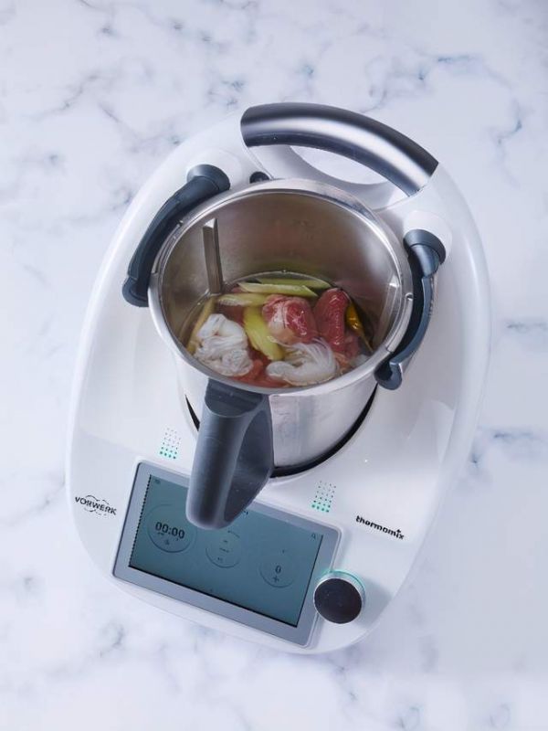 在设定温度时,把选择钮顺时针扭转到最大就是Varoma模式,Varoma模式就相当于蒸煮模式,加水后能不断生成水蒸汽,通常用来蒸煮、收汁。小勺模式下的刀头转速只有40,烹饪的时候设置刀头反转/速度小勺可以很好地保护食材本身的形状。