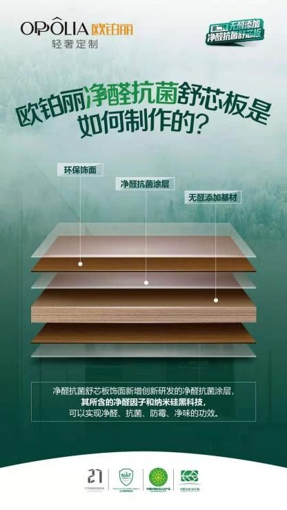 在家居领域,人造板材的应用较为广泛,其环保标准也在不断升级,无醛添加是进化的必然趋势,这既是消费需求的一种回归,也是一种升级。作为欧派集团的轻奢时尚品牌,欧铂丽汲取欧派27年的家居定制服务经验,多年来持续在用材、生产工艺、环保标准等方面进行着升级与革新,并推出了第二代无醛添加的净醛抗菌舒芯板,其所含的净醛因子和纳米硅黑科技,可以实现净醛、抗菌、防霉、净味的功效。