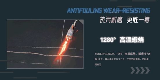 经过超万吨压机压制,1280°高温煅烧,耐磨度为5级以上,吸水率低至万分之五,产品更耐高温、更耐磨、更抗污。