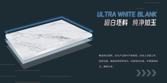 采用岩板坯体,精选纯白原料,在生产过程中严格把控,历经上百道工序,层层过滤,确保坯体纯净洁白,白度高达55度,外观温润如玉,通透立体。