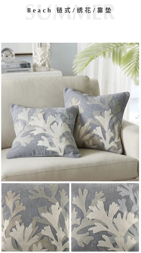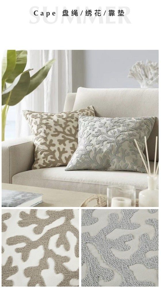同样是珊瑚图纹,此款靠垫却抓住了鹿角珊瑚呈现分枝及指状的特点,让珊瑚向四周延伸,以平铺的形式用盘绳绣花工艺将纹样填充满整面,直接而不失灵气。