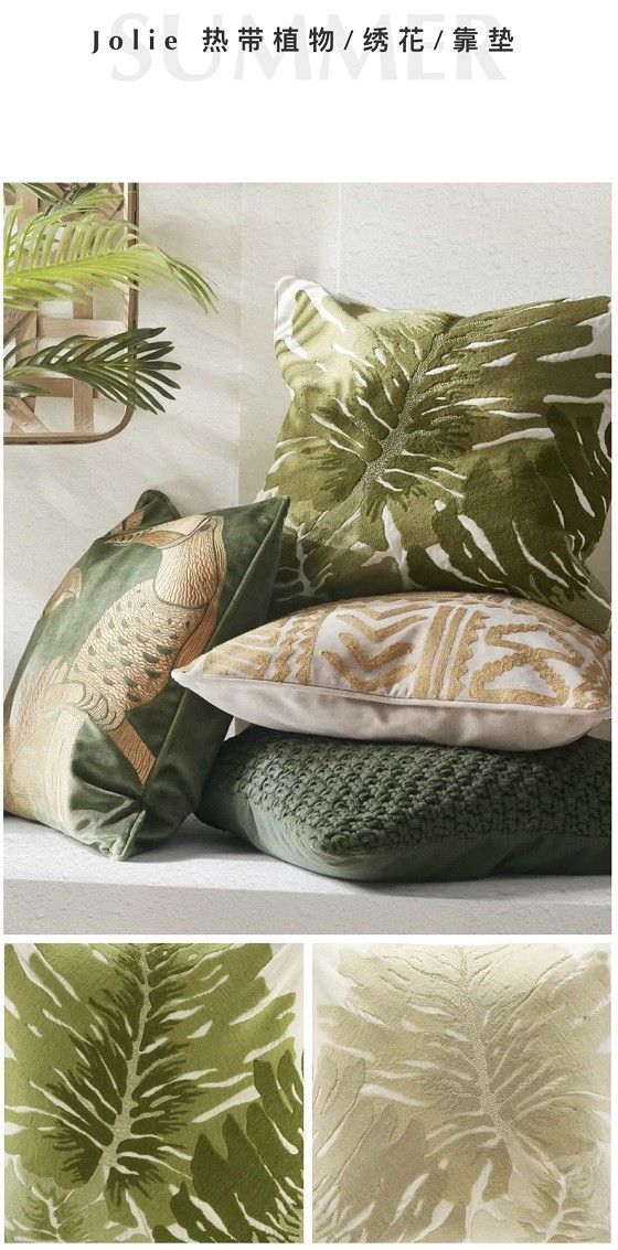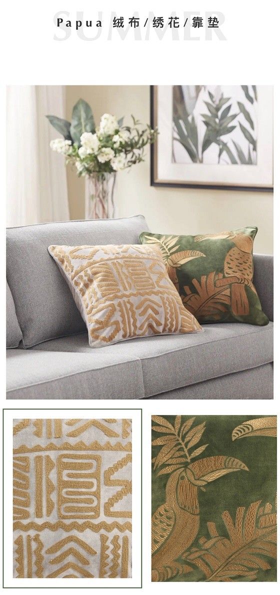 绒布面料的Papua靠垫以丛林绿和麦穗金为主调,恰如其分地搭配出生动的图腾语言,精湛的绣花带来的特殊光泽感和肌理感,使得丝丝光泽蔓延其上,画面形象更为别致。