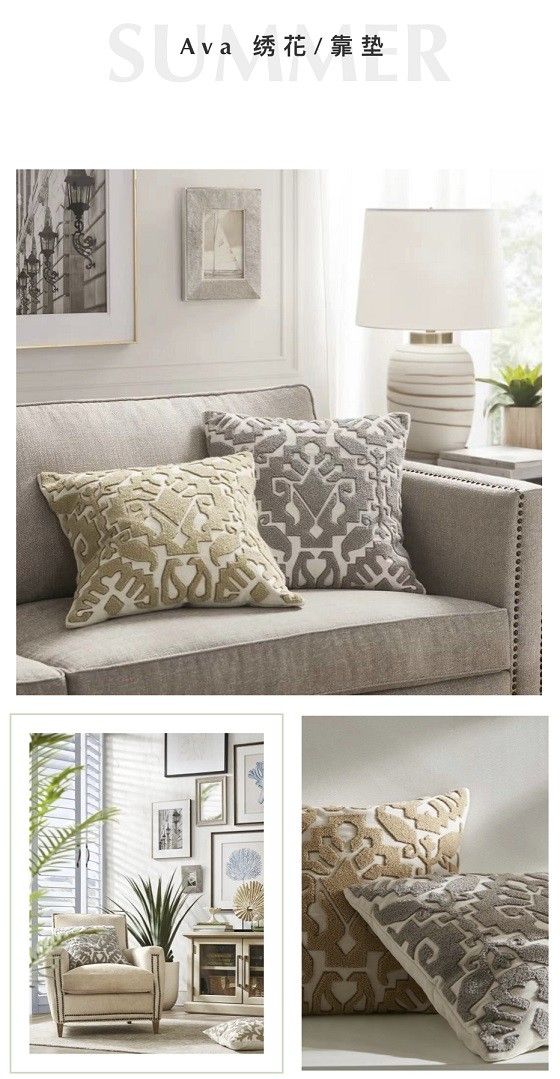 正背面选用全涤绒布,毛面柔顺,正面采用的链式绣花使层次更立体,同时带来丰富手感。无论是卡其还是浅灰,在图纹的加持下自显低调和优雅,是一款实用性和装饰性俱佳的靠垫。