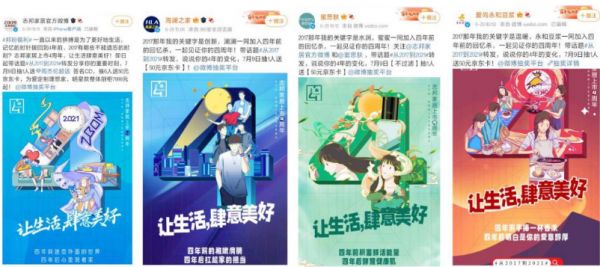 在微博端,志邦家居携手红星美凯龙、海澜之家等20家品牌举办了一场“穿越4周年”的联欢会,整合微博平台跨界资源,联合传达“让生活肆意美好”的品牌价值理念,围绕“上市4周年”的核心主题方向,打造“从2017到2021”的走心话题,从用户视角说出关于他们的4周年故事,联动B侧在微博端抢占话题热度,让本次志邦家居上市4周年活动在家居领域内的声量,获得进一步增长。