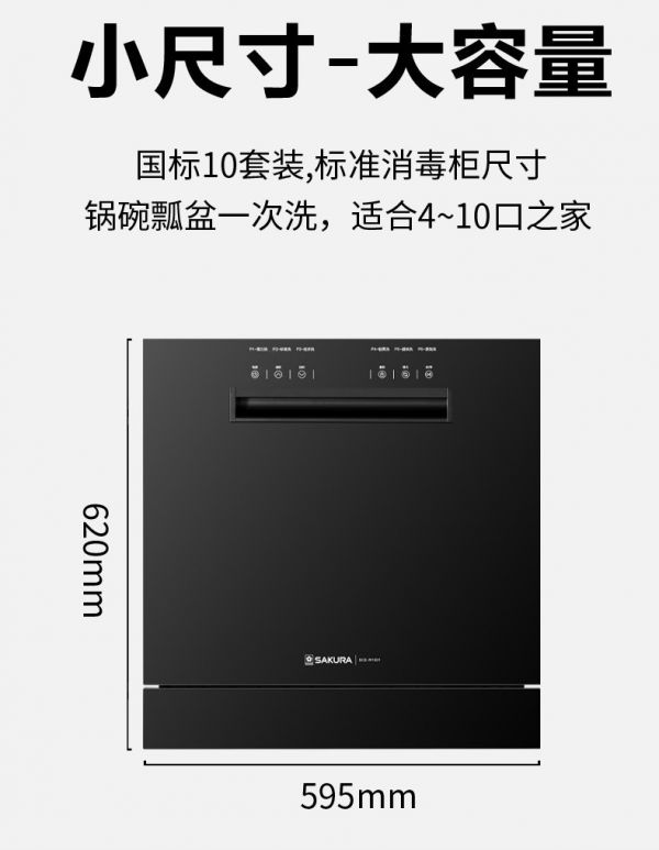 樱花洗碗机W1001尺寸虽小,但大容量很大。620mm*595mm标准消毒柜尺寸,机身精致小巧节省空间;配备国标10套装超大装载量,锅碗瓢盆均能一次洗净,适合4~10口之家。无论家庭聚会还是四世同堂,都能轻松解决洗碗压力。