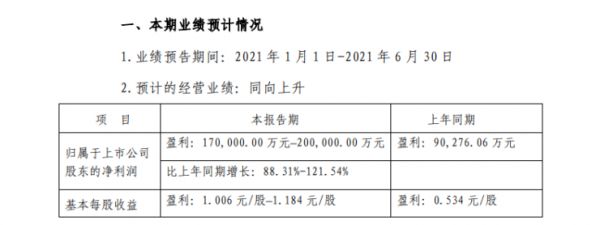 7月7日晚间,北新集团建材股份有限公司(000786.SZ)发布《2021年半年度业绩预告》显示,预计2021年上半年归属于上市公司股东的净利润17亿元至20亿元,同比增长88.31%-121.54%;基本每股收益盈利1.006元-1.184元。