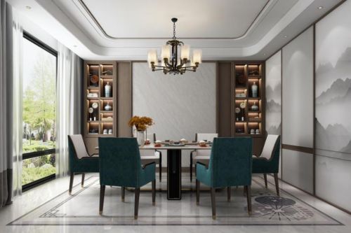 不同于客厅强调中式布局和软装搭配装饰的呈现,新中式餐厅更强调在细节的处理,尤其是瓷砖的色彩搭配方面颇为讲究。可以选择木质家具和浅灰色瓷砖结合,譬如将简一大理石瓷砖菲拉格慕系列应用于餐厅装修时,将菲拉格慕系列作为背景墙,搭配水墨画木质壁柜,整体大气不失风范。