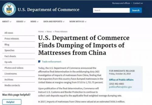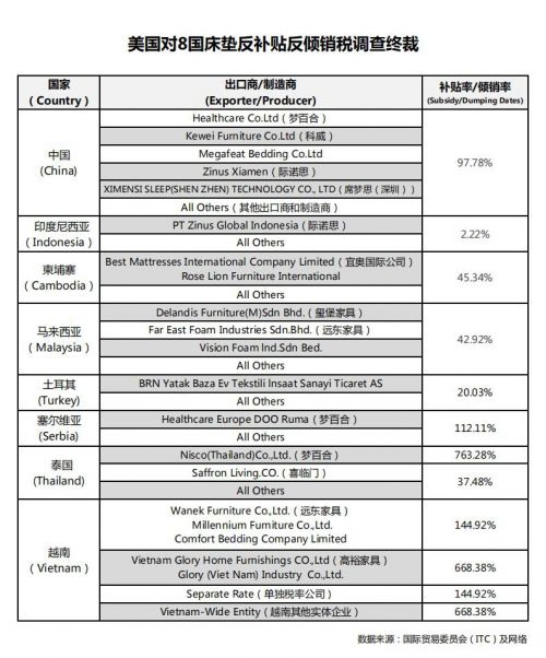 美国对中国及东南亚床垫进行反补贴反倾销终裁