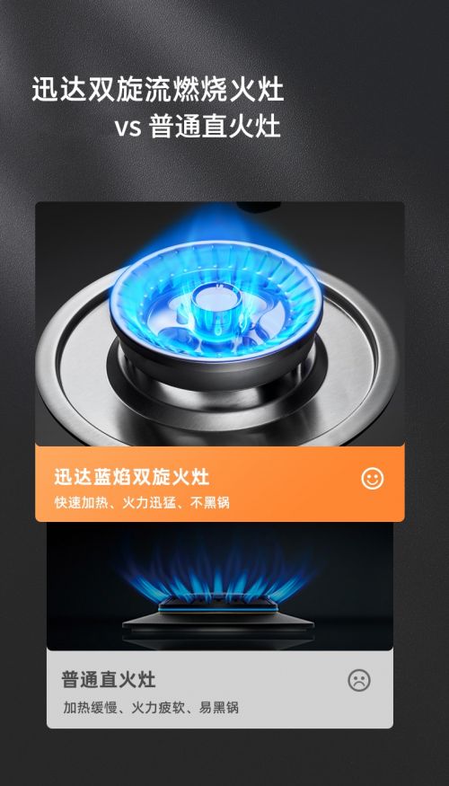 迅达厨电专注旋流猛火 最高可达双5.0kw超大火力 美味一触即发