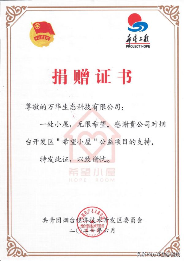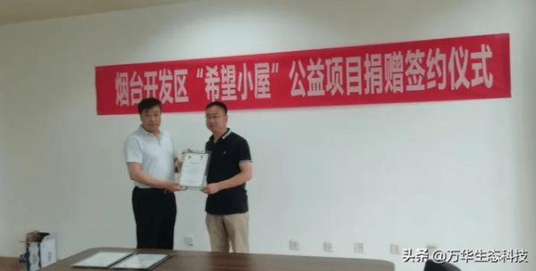 2021年6月21日,万华生态科技与烟台开发区团委、开发区爱之源公益机构,共同签署 “希望小屋”赠与合同,赠予贫困学子“人造板材、建筑装饰材料”,用于建设“希望小屋”。