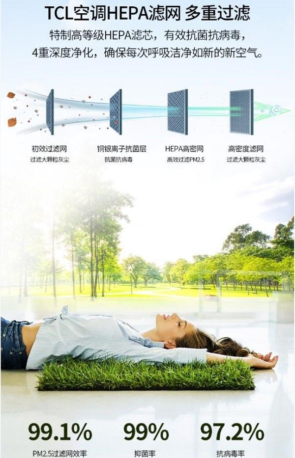 尤其是夏季,室内环境闷热且潮湿,致使尘螨和霉菌等常见的过敏原大量繁殖,过敏性疾病发病率也达到高峰,是室内过敏的高发季节。TCL卧室新风空调搭载集合初效过滤网、银离子抗菌层、HEAP高密滤网、高密度滤网为一体的四重滤网净化系统,在吹出新风之前,会对空气进行净化,有效去除细菌、PM2.5、浮尘等污染物。据科学数据表明,PM2.5去除率达99.1%,抑菌率达99%,抗病毒率达97.2%。