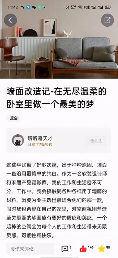 同时,住小帮也撬动了平台中大量活跃的家装达人,积极参与“居住空间探索计划”。达人使用立邦新品进行家居改造,然后输出自身的改造案例,生动、有力地展现艺术漆的新品魅力。比如,看倦了大白墙后,有的达人在对新家进行设计时,便选定了带有柔化效果的雾曲迷情款艺术漆。艺术漆自带的哑光、磨砂的纹理质感,为卧室平添了一份自然感,整个空间显得立体又梦幻。