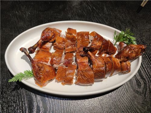 以前烤鸭一种味,现在多种口味。传统用刀片烤鸭肉的做法,要求一定的刀工,现在这款风味北京烤鸭,不但皮薄油少,而且肉紧骨酥可以直接切成小段。小孩喜欢吃甜的,可以蘸着冰花酸梅酱吃,解腻;年轻人喜欢吃辣的,可以蘸着