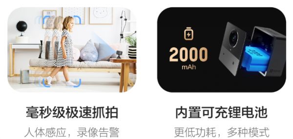 萤石BC2电池摄像机的最大特点是全无线设计,它支持WiFi联网,内置2000mAh不可拆卸锂电池,真正做到全无线供网供电。