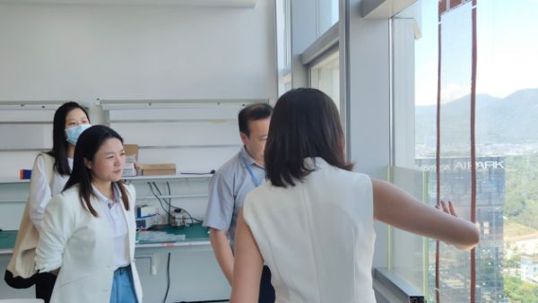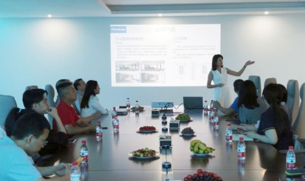 参观中,古总就福摩贝斯的发展历程,公司文化,国内国际市场情况及行业未来发展前景做了阐述,并向参观团展示了福摩贝斯智能调光玻璃和智能隔热膜的工作原理及应用效果。