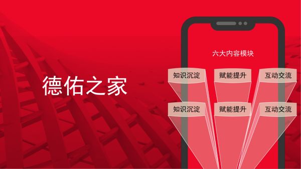 德佑之家围绕“知识沉淀”“赋能提升”“互动交流”“运营活动”“行业资讯”“文化宣传”六大模块,依托于德佑之家的强大后台,实现了:第一,让信息在德佑人之间无差别传递;第二,让交互在德佑人之间更有效进行;第三,让优秀可学习,可传递,可复制。