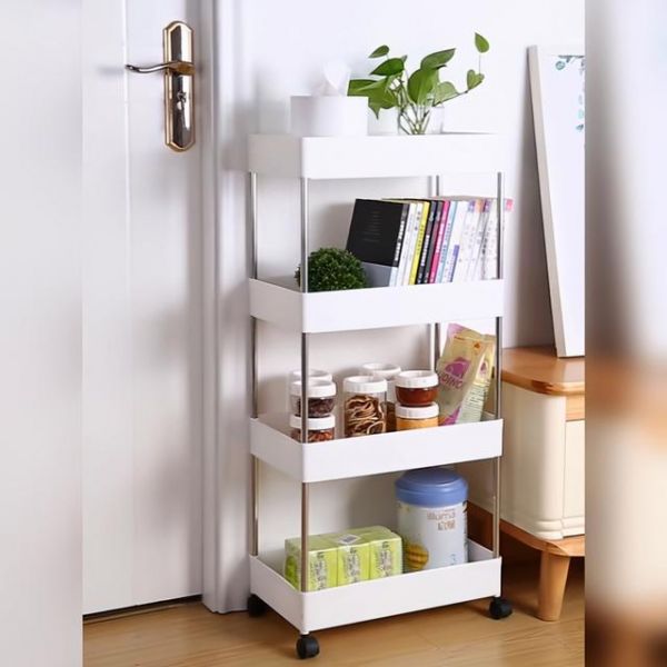 而现在设计师考虑到灵活变动,用了移动的置物架来代替。一样是多层设计,而且层的高度还增加不少,哪怕是放入书籍也可轻松拿出。都是可移动的,若是想到阳台看书,也可推着车去,很方便。