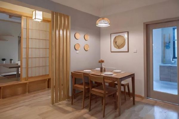 餐厅在进门右侧转角处位置,靠墙摆放一张简约式长方形实木餐桌,搭配一个长条凳和两把实木餐椅,紧凑而节省过道空间,在左侧门洞处安装了实木格栅式隔断,时尚通透,突出日式风格。