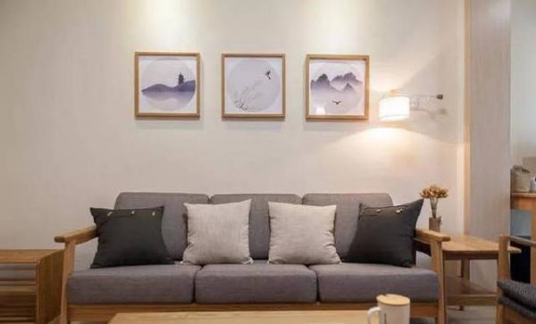 电视对面摆放一个布艺靠背、坐垫+实木框架的日式三人沙发,对面是长条型小茶几,右侧是方形实木边几,在装饰挂画和小抱枕、花艺等点缀下,让淡雅的空间充满活力。