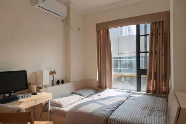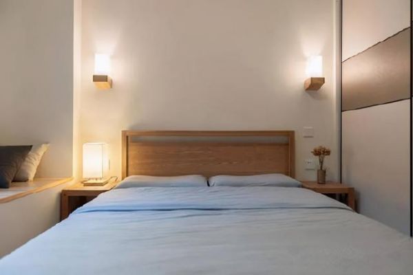 次卧空间较小,因此靠墙定做一个到顶的移门大衣柜,不占过道空间,储衣空间充足。实木大床两侧对称摆放两个精巧的床头柜,配置了日式壁灯和台灯,让睡眠空间舒适健康温馨。