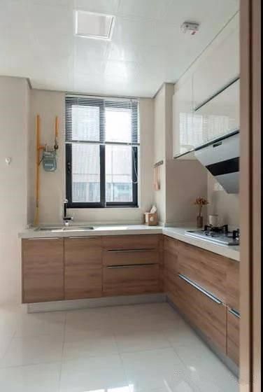 餐厅右侧的玻璃门内是厨房,规划了L型布局的白色+原木色橱柜,搭配米色操作台面、墙面和地面,清新整洁时尚,小夫妻平时在这里制作一日三餐十分宽敞舒适。