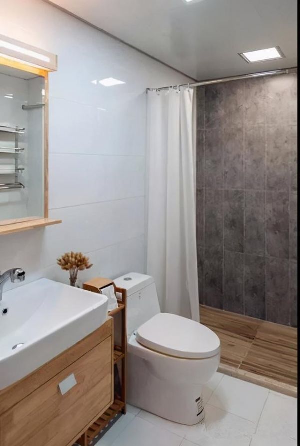 卫生间布置比较简洁,悬空式洗漱柜旁放一个实木置物架,见缝插针式收纳组合让各类洗护用品轻松收纳,保持室内整洁清爽。淋浴间用浴帘+挡水条做了干湿分离设计,让时尚清新的卫浴空间让干净舒适便利。