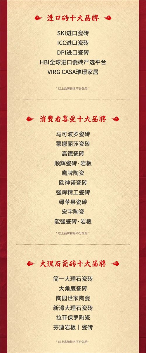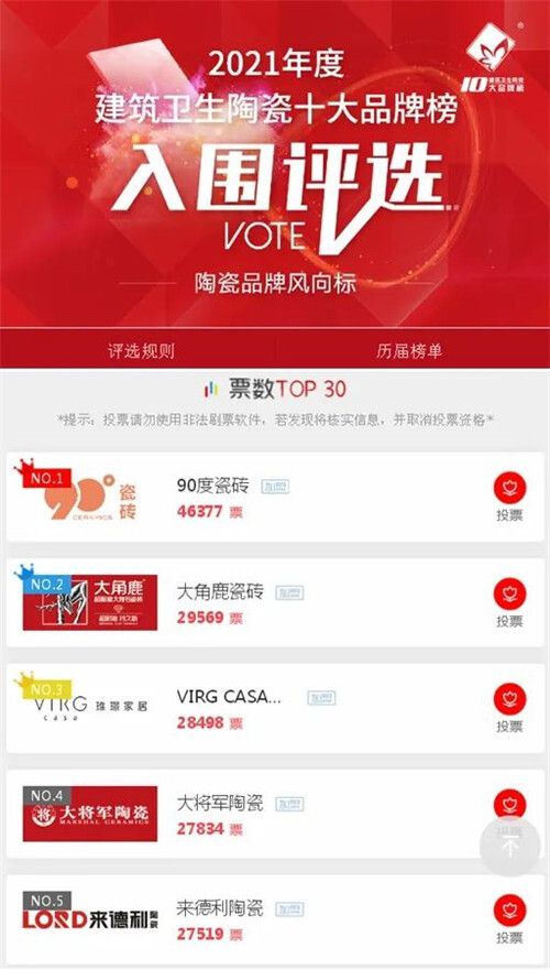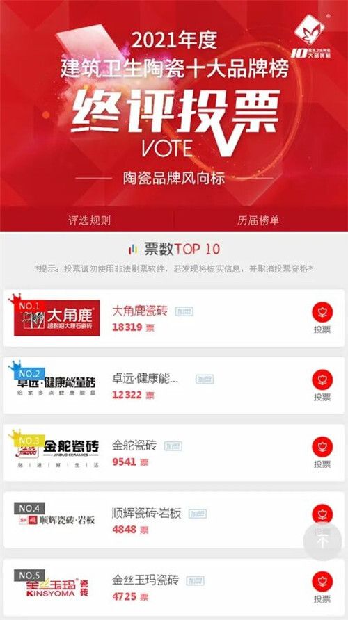 在两轮共46天的网络投票和涵盖品牌的影响力、生产力、产品力、原创力、设计力、内容力、运营力等多个维度的专家评审中,经过主、承办方既充分尊重网络民意又充分考虑各参评品牌真实实力的客观、综合考量,85个优秀的陶瓷品牌在紧张激烈的角逐中脱颖而出,分别成功入选“陶瓷十大品牌”“瓷砖十大品牌”“陶瓷一线品牌”“卫浴十大品牌”等15个细分榜单。